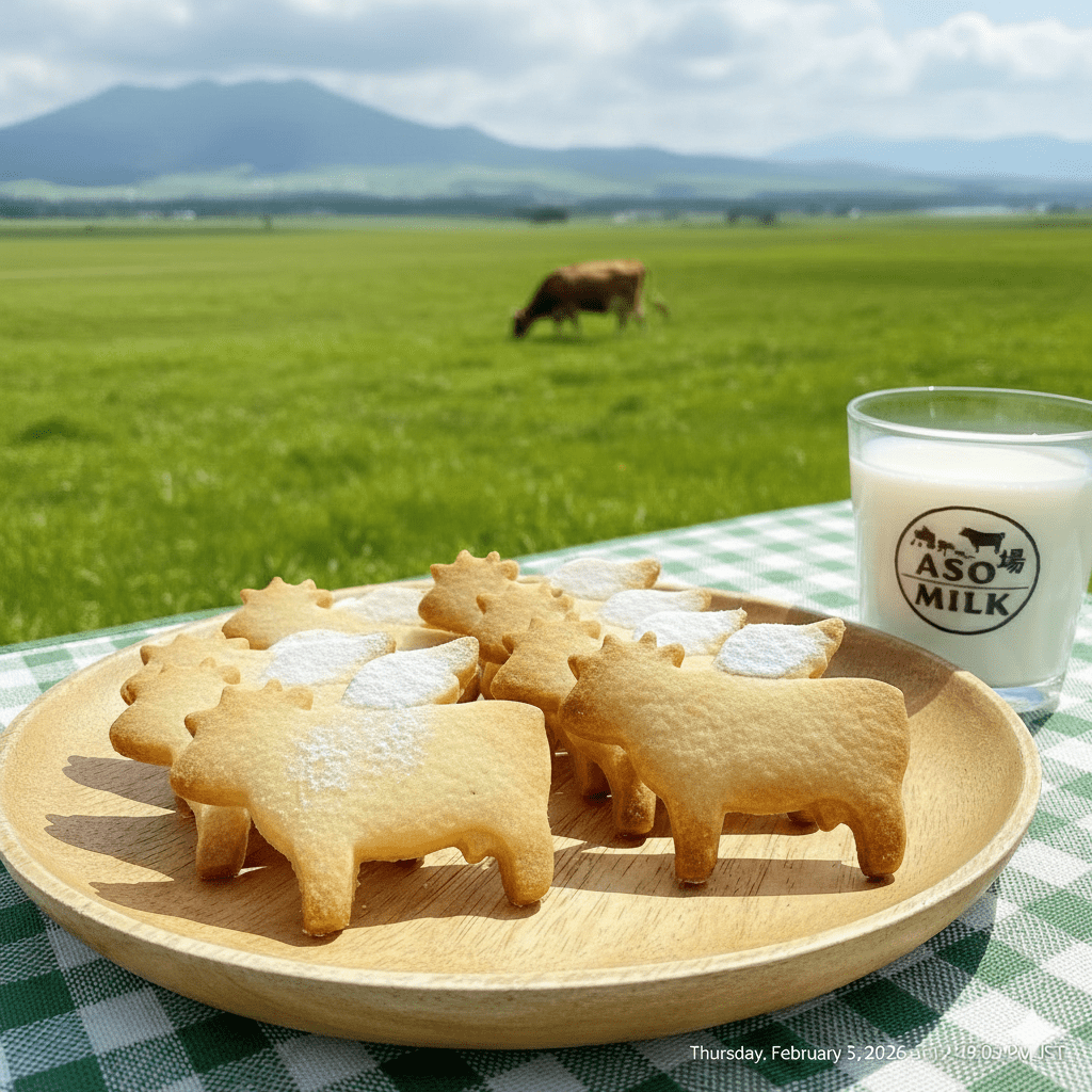 - 阿蘇の草原とぶ牛クッキー(阿部牧場) 阿蘇の牧場の新鮮なミルクを使った、牛の形が可愛らしいクッキー。見た目も愛らしく、素材の良さが伝わる優しい味です。